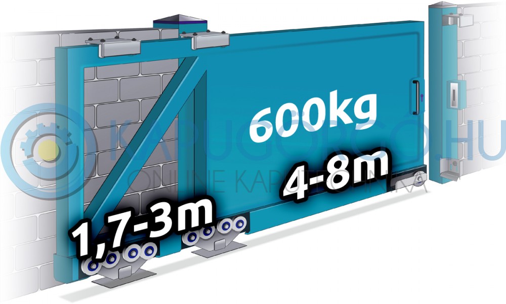 | Ajánlott teljes kapuhossz: 8,93 méter | Görgő: 6 csapágyas, átmérő: 53mm x 6 db, erősített 150x120 mm lemezen |